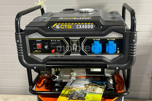 Однофазный портативный бензогенератор CTG CX4000, резервной мощностью 3.5 кВА. Генератор оснащен электронной панелью с цифровым дисплеем. Тип запуска - ручной. Объем топливного бака 15 л.
